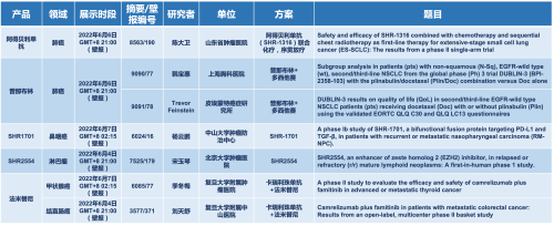 2022 ASCO年会另有5款开云体育医药上市前抗肿瘤创新药的相关研究被接收为壁报,包括SHR-1316、普那布林、法米替尼、SHR-1701和SHR2554,他们的单药或联合方案相关7项研究被接收为壁报,覆盖肺癌、鼻咽癌、淋巴瘤、甲状腺癌和结直肠癌等领域。