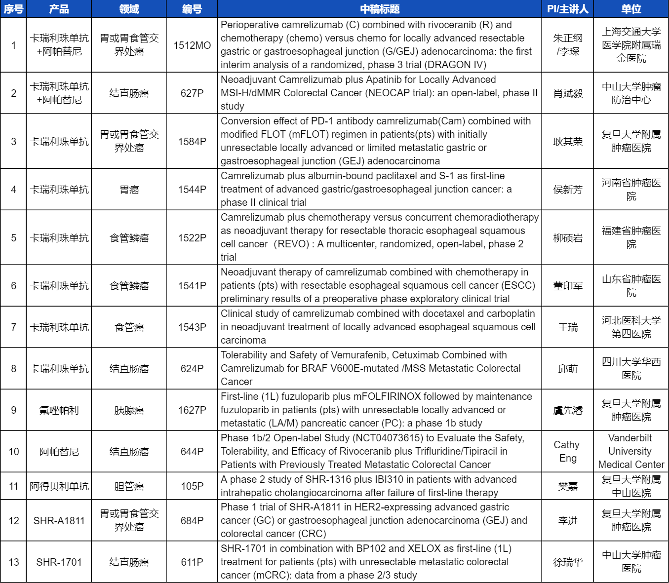 在消化系统肿瘤领域,开云体育创新产品相关研究共入选1项口头报告和12项壁报展示。除了经典的明星药物卡瑞利珠单抗和阿帕替尼,SHR-A1811、SHR-1701等未上市创新产品也有相应研究入选。此外,阿得贝利单抗、氟唑帕利等已上市药物也在积极探索新的适应症,本次ESMO大会分别有肝内胆管癌和胰腺癌相关研究入选。这些新老药物前沿研究的不断出现,有望为消化系统肿瘤患者带来新的福音!