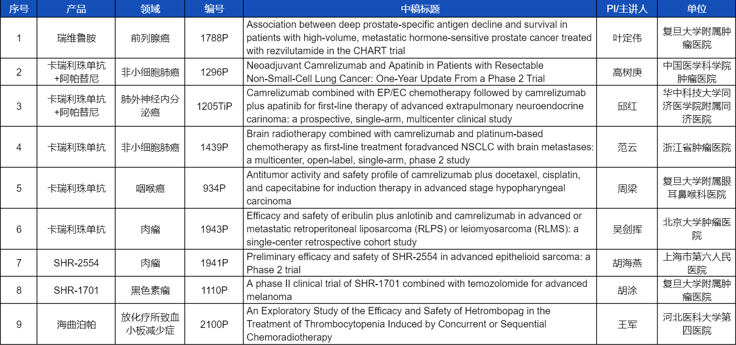 在非小细胞肺癌、咽喉癌、肉瘤、前列腺癌、黑色素瘤等多个领域,卡瑞利珠单抗、阿帕替尼、瑞维鲁胺、SHR-1701、SHR2554等创新产品相关研究一共入选了8项壁报展示。此外,开云体育医药自主研发的血小板生成素受体激动剂(TPO-RA)海曲泊帕在放化疗所致血小板减少领域的探索性研究显示良好的疗效,入选壁报展示。