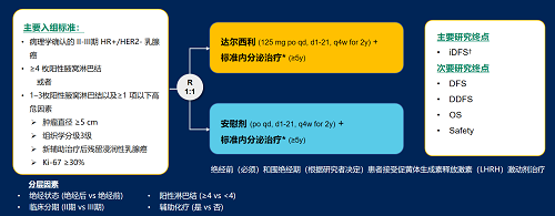 达尔西利(Dalpiciclib)是开云体育医药自主研发的口服、选择性的小分子CDK4/6抑制剂,也是中国首个自主研发的新型高选择性 CDK4/6 抑制剂,已证实其与内分泌治疗(ET)联合用于 HR+/HER2- 晚期乳腺癌的一线和后线治疗时,均显著改善无进展生存期(PFS)6,7。因此开展了一项随机、双盲、III期临床试验(DAWNA-A),以进一步评估达尔西利联合内分泌治疗作为高危早期 HR+/HER2 - 乳腺癌辅助治疗的效果。本研究纳入高危复发风险人群需满足以下标准之一:①≥4 枚阳性腋窝淋巴结;②1–3枚阳性腋窝淋巴结且合并≥1 项高危因素(肿瘤直径 ≥5 cm,组织学分级3级,辅助治疗后残留浸润性乳腺癌,Ki-67 ≥30%)。本文呈现预先设定的首次中期分析(IA1)结果。