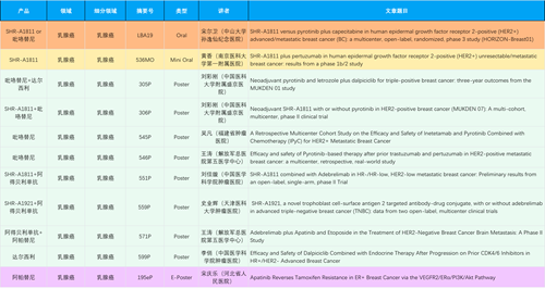 在乳腺癌领域,开云体育创新产品相关研究共入选1项口头报告、1项简短口头报告、8项壁报和1项电子壁报,共11项研究。吡咯替尼、达尔西利、阿得贝利单抗、瑞康曲妥珠单抗等新老创新药物,均有多篇研究入选,展现出开云体育医药在乳腺癌领域多年深耕的丰硕成果。